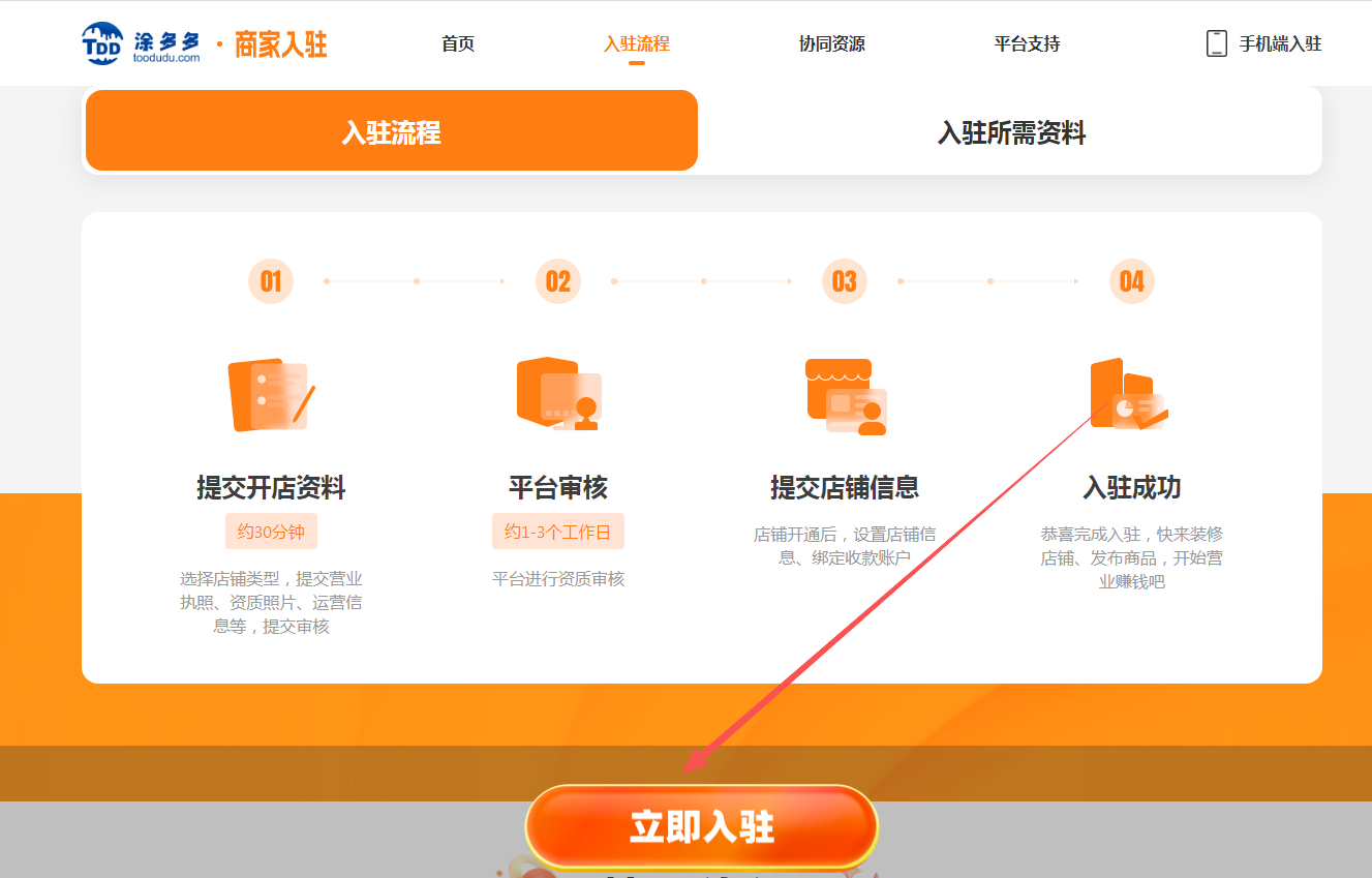 2、查看商家入驻所需要准备的资料,及其他详情内容部分,阅读完毕后点击“立即入驻”。