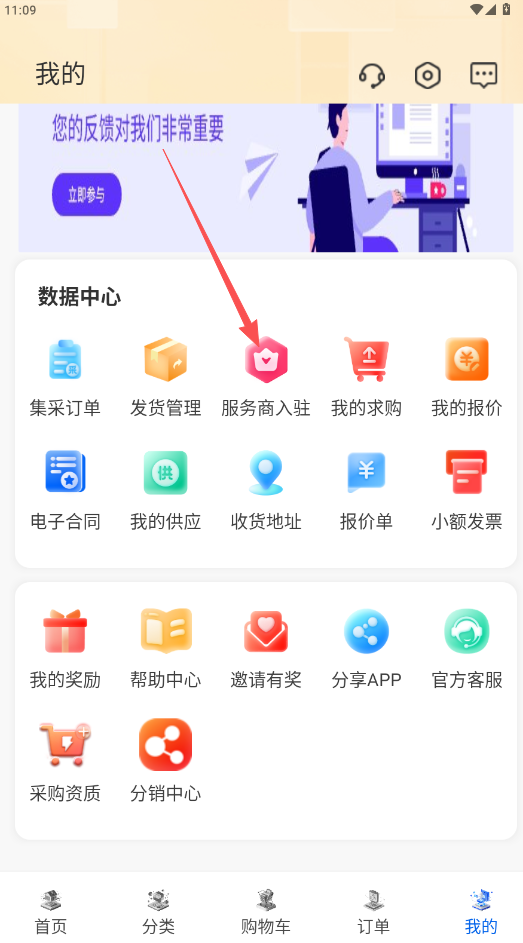 1、打开我的页面,在数据中心版块点击“服务商入驻”选项。