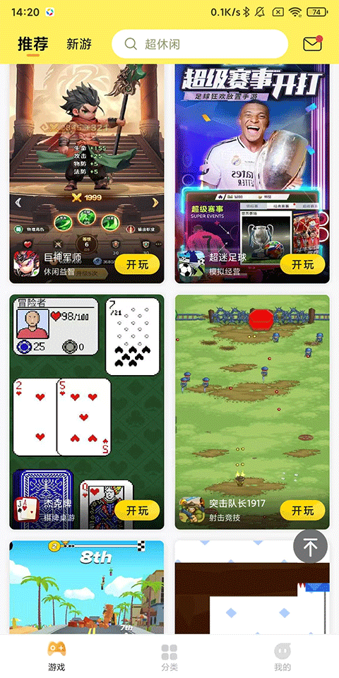 2、在分类界面有着超多类型的游戏,你想玩的这里都有!你还可以直接搜索你想玩的游戏。