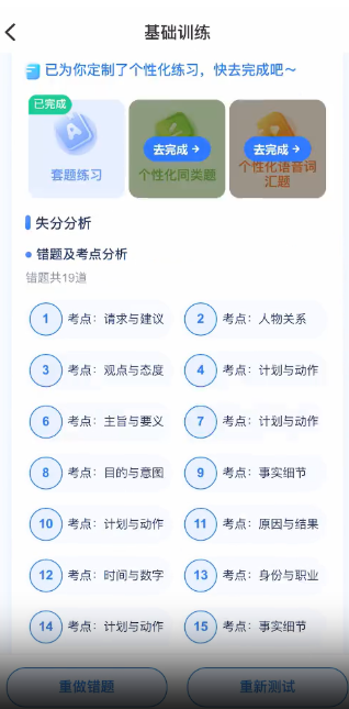 3、呈现从考点、语音、词汇维度的问题。并推送各个维度的个性化训练,哪里掌握薄弱就训练哪里。