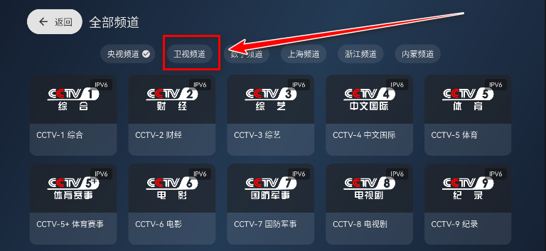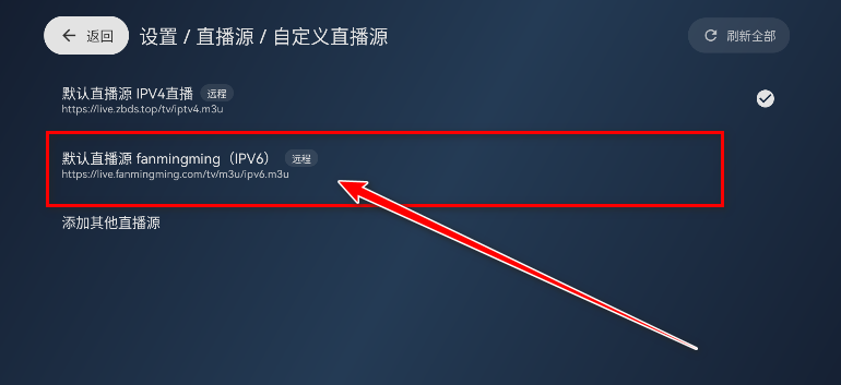 2.可以根据自己的网络类型来选择使用哪个源,默认源是ipv4源,如果想切换到ipv6源也是可以的,具体怎么切换源请参考上一个问题的图文解答。切换成ipv6源之后,点击全部频道。