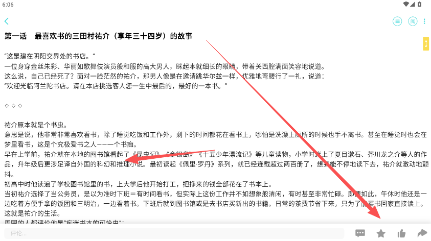 4、来到小说阅读的文字内容部分,向下滑动是查看最新章节,左右是小说章节翻页。