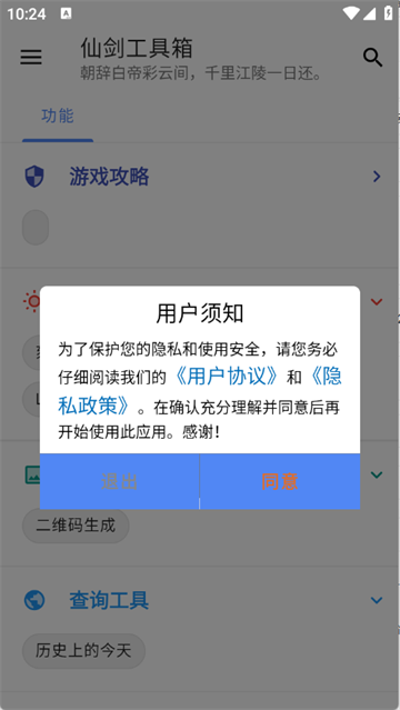 1、首先在本站下载仙剑工具箱app,同意隐私政策与用户协议。