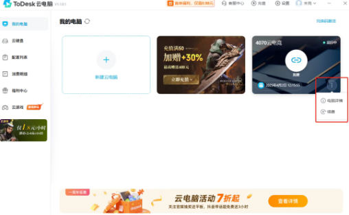 点击右侧小标展开,看到桌面详情和续费,点击【续费】可直接购买云电脑使用时长