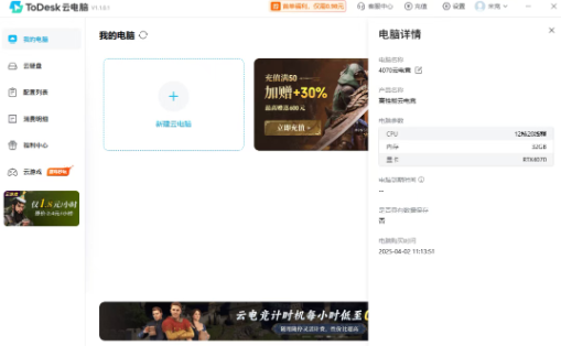 点击【桌面详情】可查看当前云电脑的配置信息和到期时间