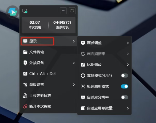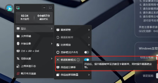 5、点击【极速刷新模式】开启,将画面刷新率对齐至显示器画面刷新率