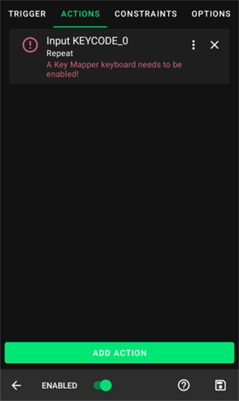 键映射器会让你知道你是否需要做任何额外的步骤,使行动可以工作。在图片中,操作中有一条错误消息,告诉您“启用”一个键映射器键盘。