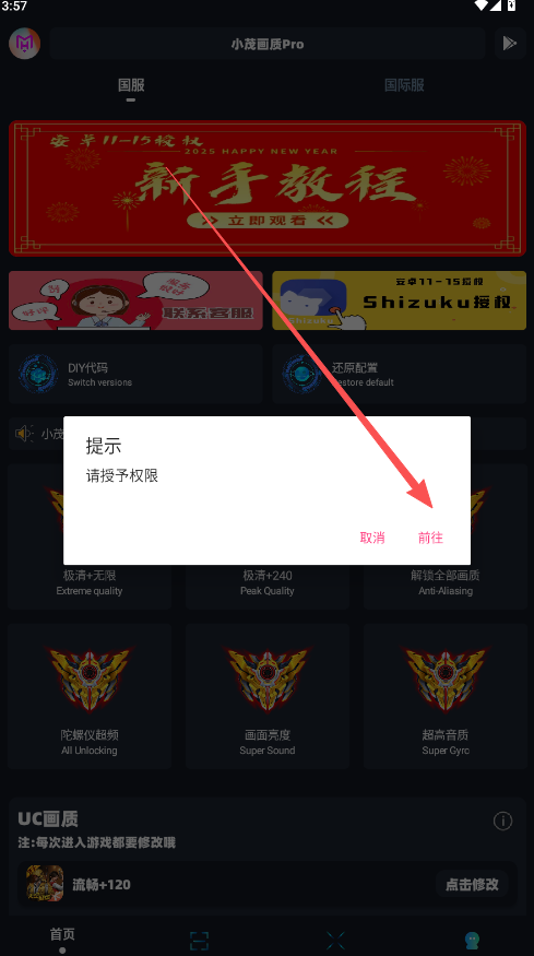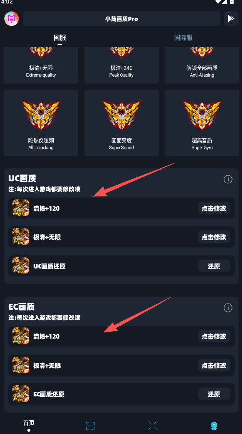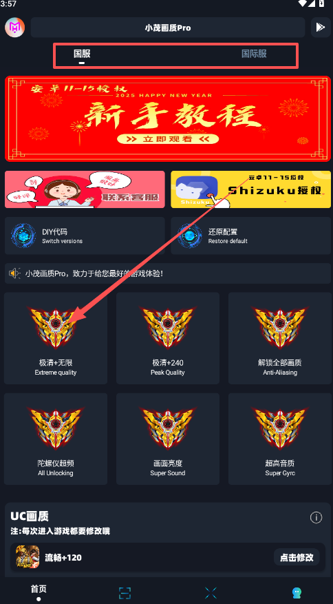 1、小茂画质120帧画质主要分布在UC画质和EC画质两个版块,每次进入游戏前都需要先进行修改后开启对局。