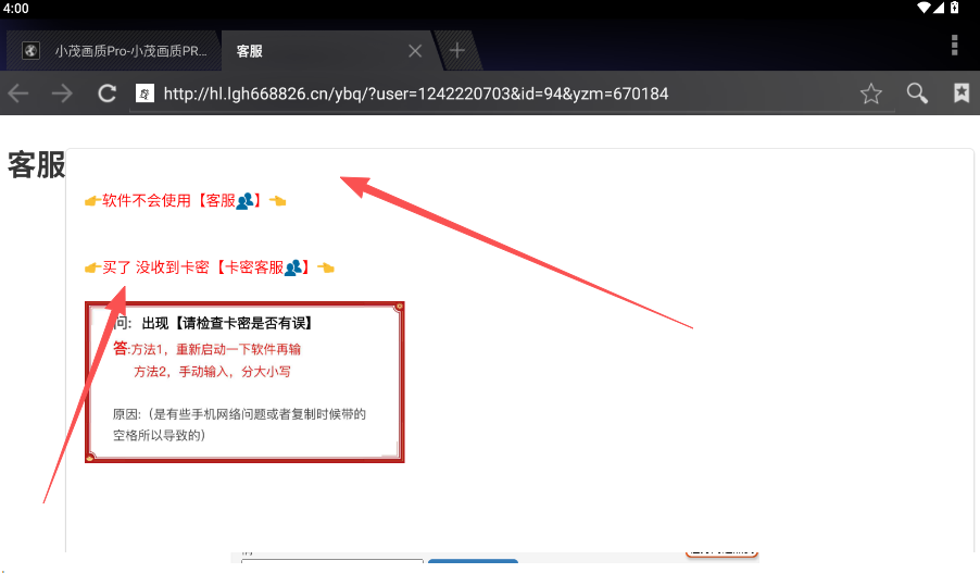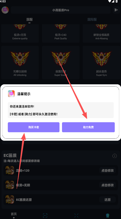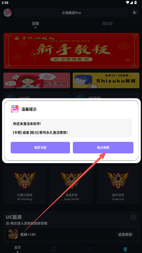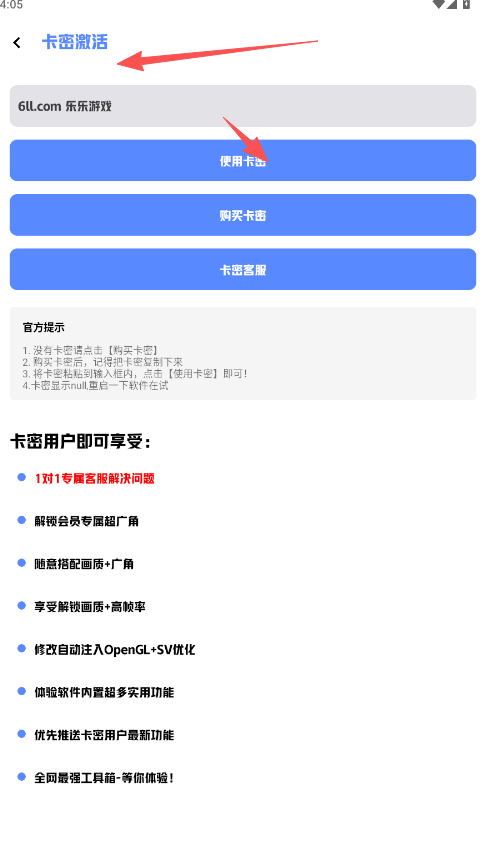 5、支付下单完成后获取专属激活卡密,返回刚才的界面点击“使用卡密”激活120帧画质修改权限。