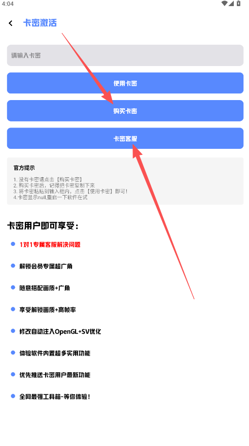 3、点击卡密激活页面“购买卡密”选项。