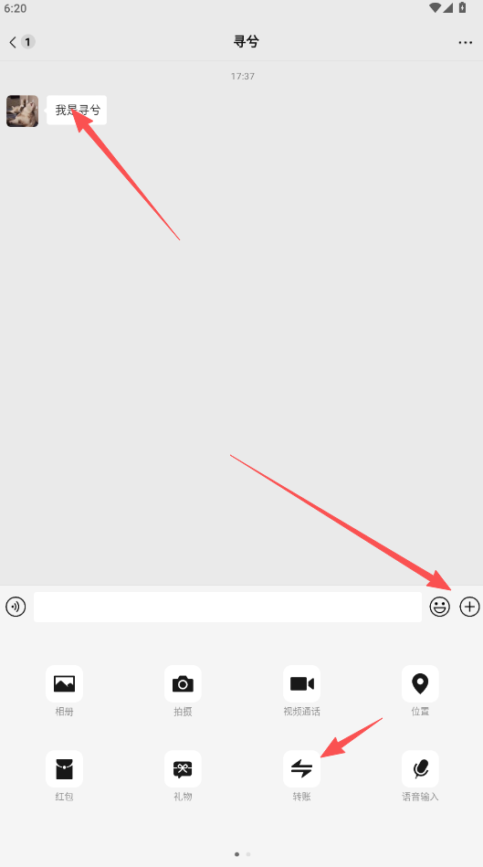 2、点击对方头像切换发送信息,紧接着点击下方+聊天框进行“转账”。