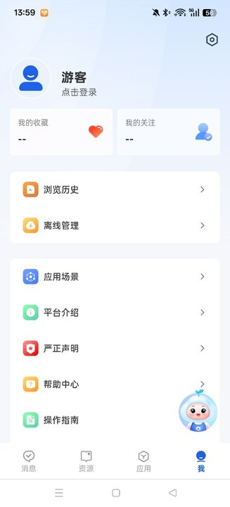2、注册操作在软件我的界面中完成,可以很清楚的看到当前用户身份为游客,先选择上方的点击登录。