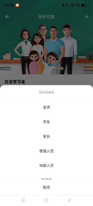 2、点击以后进入到身份切换页面,当前显示的事社会工作者也就是学生家长,想要切换到学生只需要简单的点击右上方的+号。