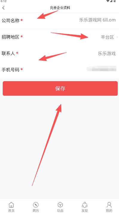 4、在企业资料栏将各项信息补全:公司名称、招聘地区、联系人等并点击保存。