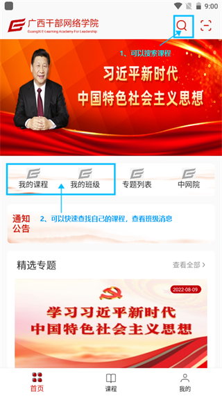 2、在导航栏,可以快速查找自己已添加的课程,以及班级消息