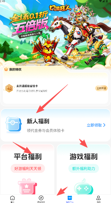 1、凌天众游网用可在平台福利中心版块,分别打开领取新人福利、平台福利和游戏福利。