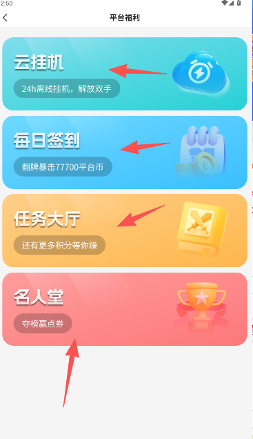 3、平台福利:以云挂机、每日签到、任务大厅和名人堂4个部分,选择参加其中的各项活动,完成指定任务领取。