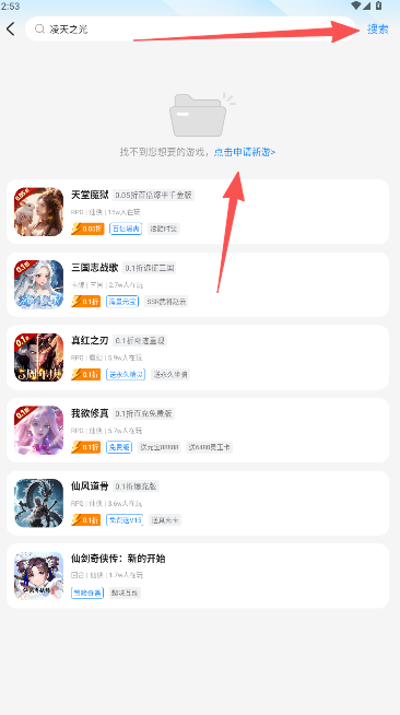 2、输入游戏名称后点击搜索查找,如果搜索结果提示是找不到,那么就继续点击选择申请新增。