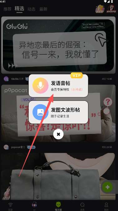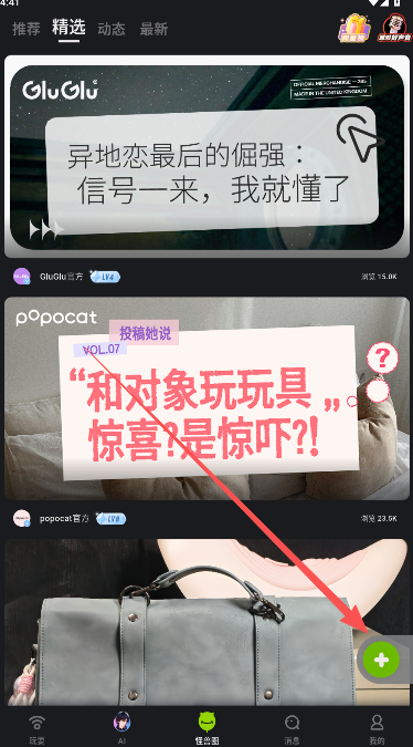 1、点击怪兽圈页面,选择右下方+选项打开。