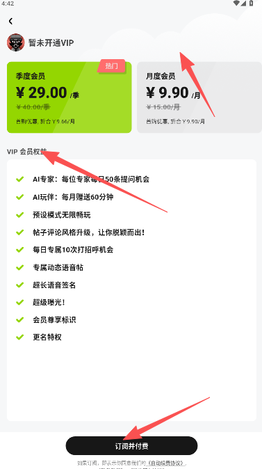 3、支付相应费用完成季度和月度会员的开通,之后就能够发送语音消息啦。