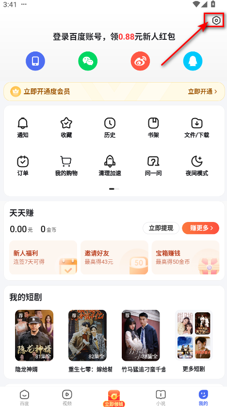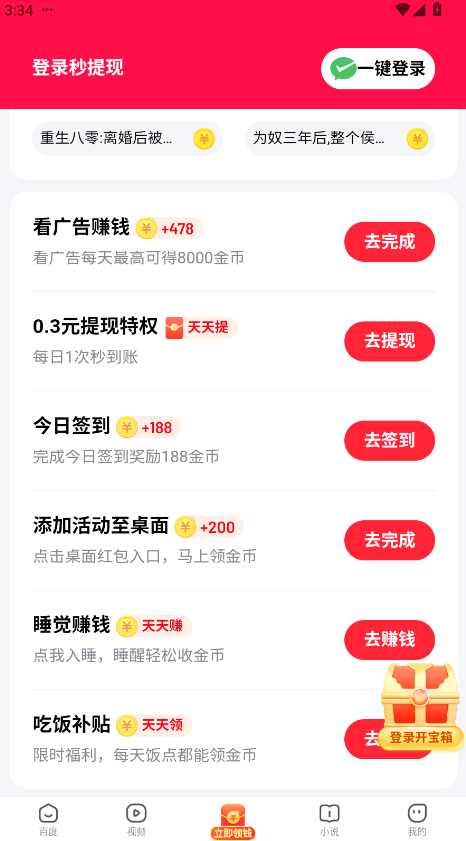 边搜索边赚钱(通过签到、看视频、阅读文章等任务获取金币,可兑换现金)