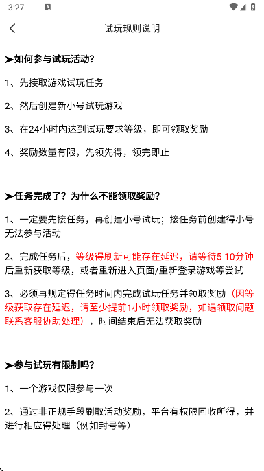 3、必须再规定得任务时间内完成试玩任务并领取奖励(等级获取存在延迟,请至少提前1小时领取奖励,如遇领取问题联系客服协助处理),时间结束后无法获取奖励