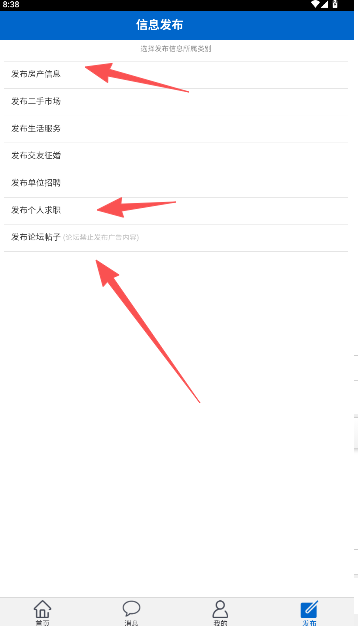 2、内容发布之前,可在房产、二手市场、生活服务、交友征婚、个人求职、论坛帖子和单位招聘等版块选择所属类别。