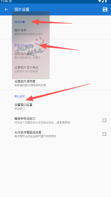 FloatPicture悬浮图片安卓悬浮窗软件允许将任意静态图片设置为一个可自由化定制的悬浮窗图显示版本,用户在全局条件下对图片本身属性进行调试修改,以达到动态git图、静态图之外的其他效果。