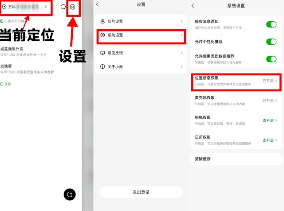 1、小美的页面很简洁,进入app后可以点击左上角的小按钮,进入设置,给小美开放位置信息等权限。定位信息和美团APP里是同步的,同时也支持自定义。