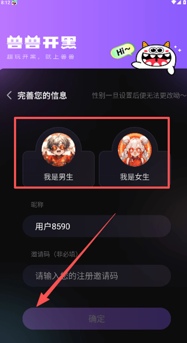 2、完善个人信息,性别等资料补充完成,选填邀请码进入。