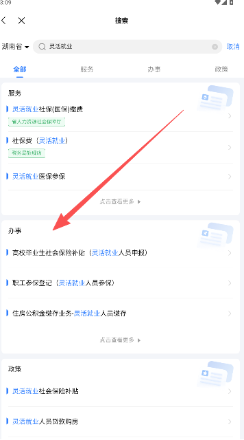 5、在首页界面,点击上方的搜索栏目,输入灵活就业,点击搜索。