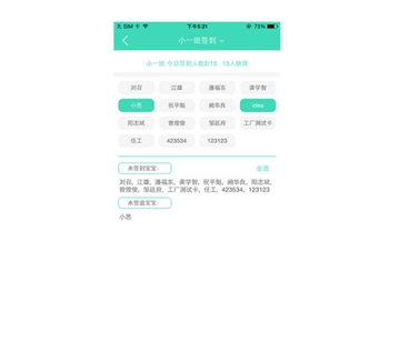 点击宝宝相对应的名字,没有点到的宝宝就是未到状态,也可以选择全选按钮,没有到的宝宝点击相对应的名字,下方会显示未签到宝宝的名字,完成后点击提交按钮,确认提交。