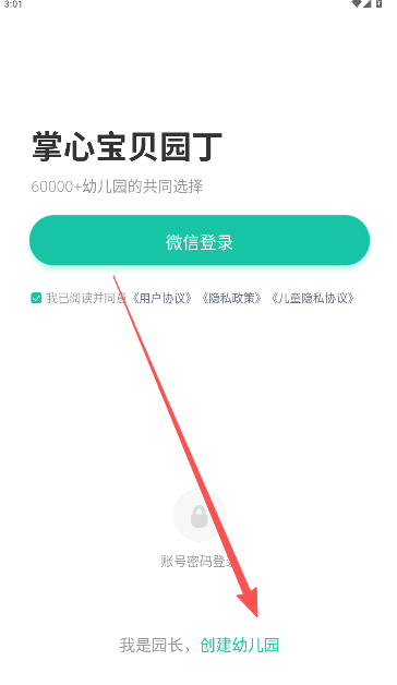 1、点击软件登录页面下方我是园长并创建幼儿园。