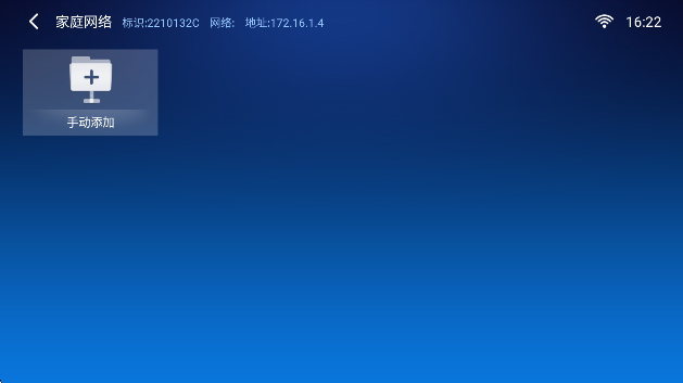 4、家庭网络:点击家庭网络需要手动进行添加,输入设备的地址完成添加即可,设备地址到需要添加的设备上查看。