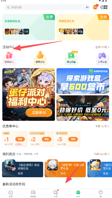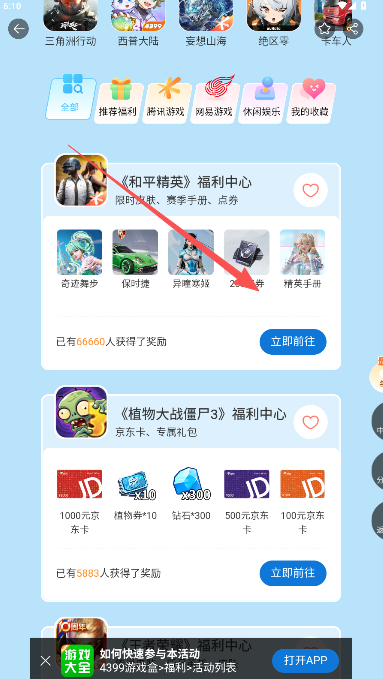1、点击打开4499游戏盒福利页面版块,选择活动中心的福利中心栏目。