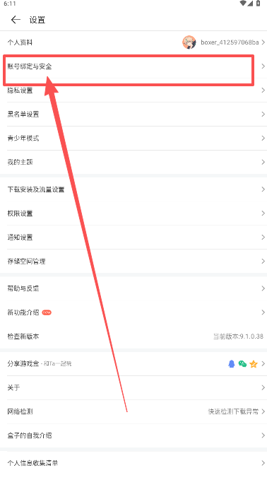 1、点击4499游戏盒设置栏目的,账号绑定与安全。