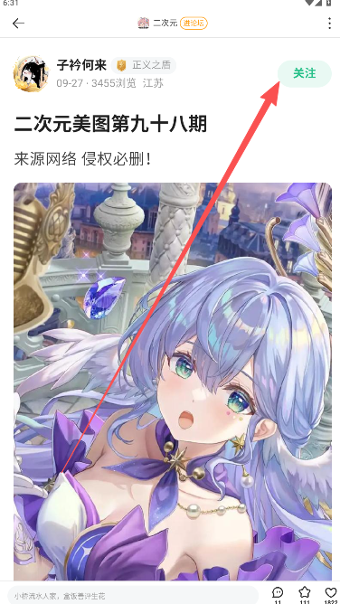 2、点击发布者右上方的关注选项,关注即添加好友,如果他回关的话,算做双向。