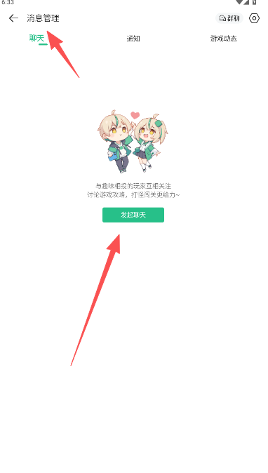 2、切换到消息管理页面的聊天频道,选择发起聊天。