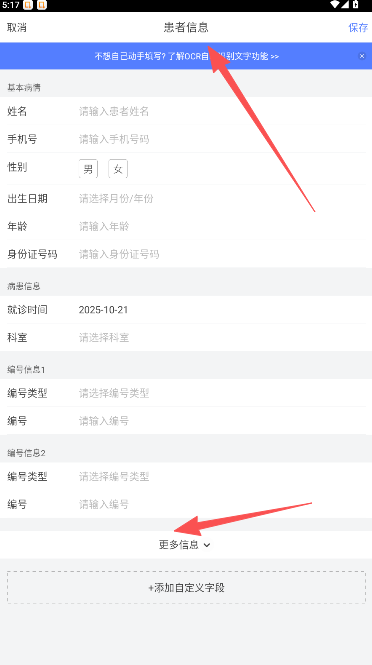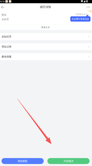 2、病历详情页,对患者的基本信息做出完整补充更新,同时添加标签和诊断辅助信息,点击开始随访、添加病程,随时关注病人最新健康情况。