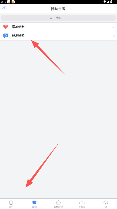 4、如果你所添加的患者行程比较多,手头上要处理的消息要通知太多忙不过来的话,可以在随访页面中,选择群发通知,更快速的完成消息传达。