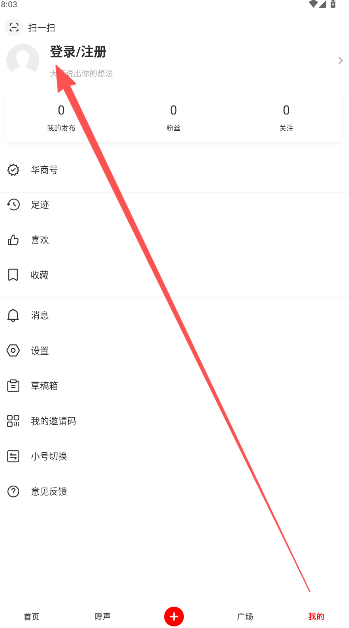 1、点击我的页面上方登录/注册选项。