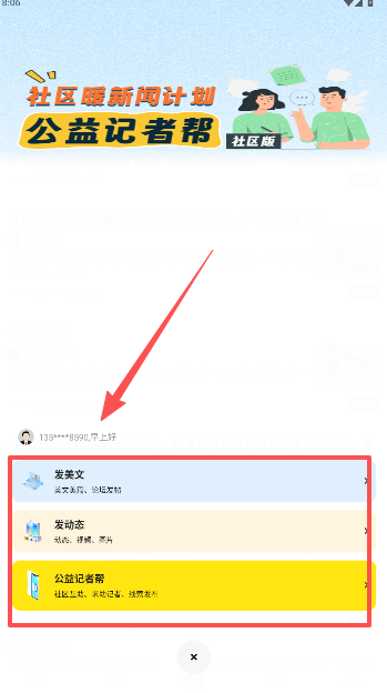 5、中间红色+号,属于软件内另外一项,主要是以论坛的形式展现,比如发美文日常记录、发动态或是参与公益记者活动等等。