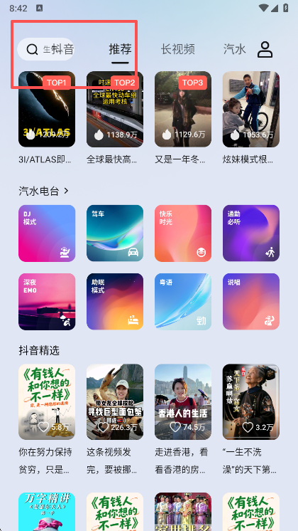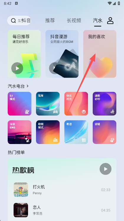 3、回到汽水专区,点击抖音漫游,就可以听到抖音的歌曲了