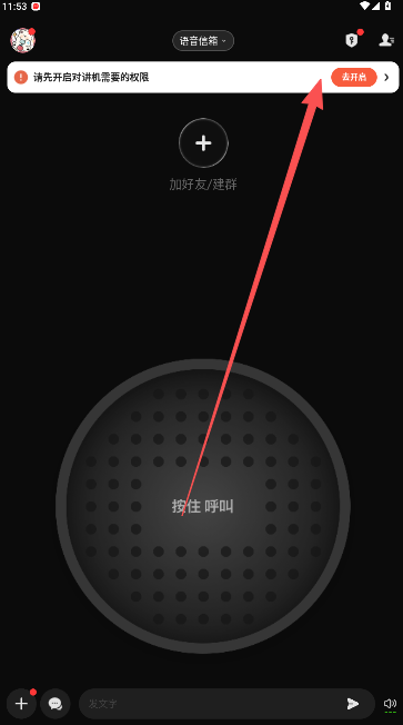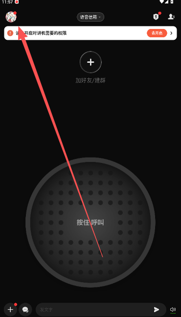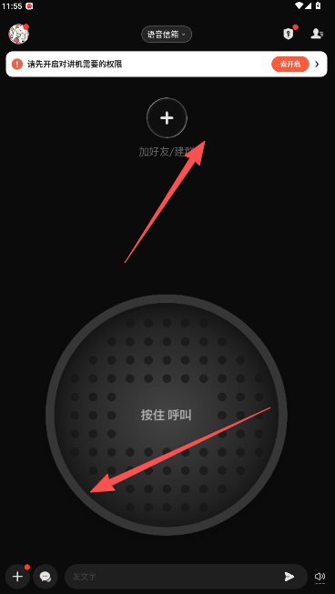 6、引导部分完成后,来到之前的地方选择加好友建群,长按中间的按住呼叫完成语音对讲。