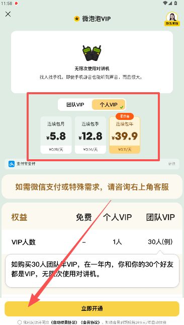 1、微泡泡对讲机免费使用的次数是有限制的,如果长期使用建议还是订阅VIP。