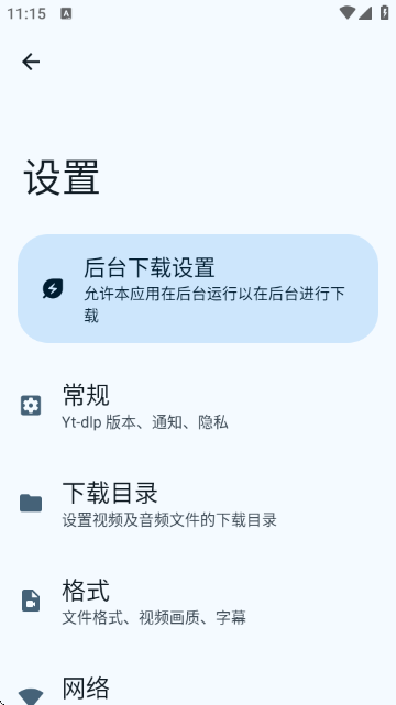点击左上角设置图标,可进入设置界面,对后台下载、常规(Yt-dlp版本、通知、隐私)、下载目录、格式、网络等进行配置。