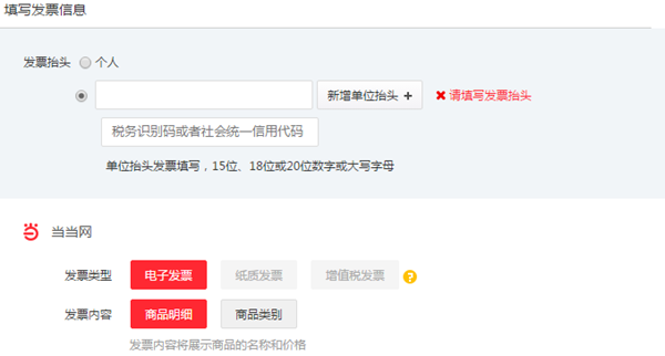 1、使用当当网app下单购物时,在发票信息处,选择“电子发票”,填写发票抬头、者社会统一信用代码、发票内容等基本信息,确保没有遗漏。