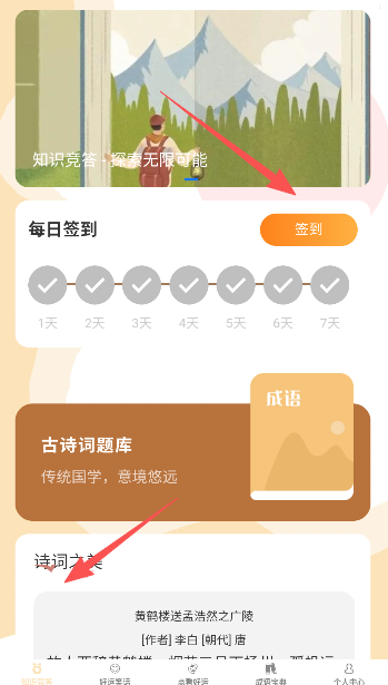 1、首页, 下载进入之后,先参加每日的签到活动领取新用户奖励,之后可以看到许多优美的古代诗词以及和它相关的题库部分,可点击参与练习。