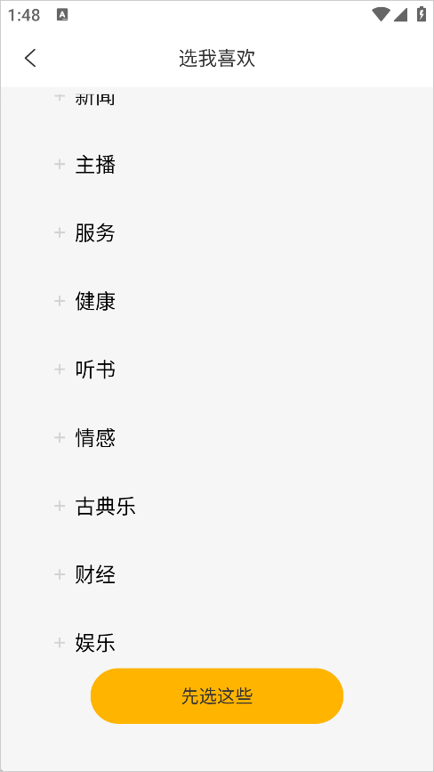 4、点击喜欢的分类,往下还有更详细的分类,最后点击先选这些就完成了