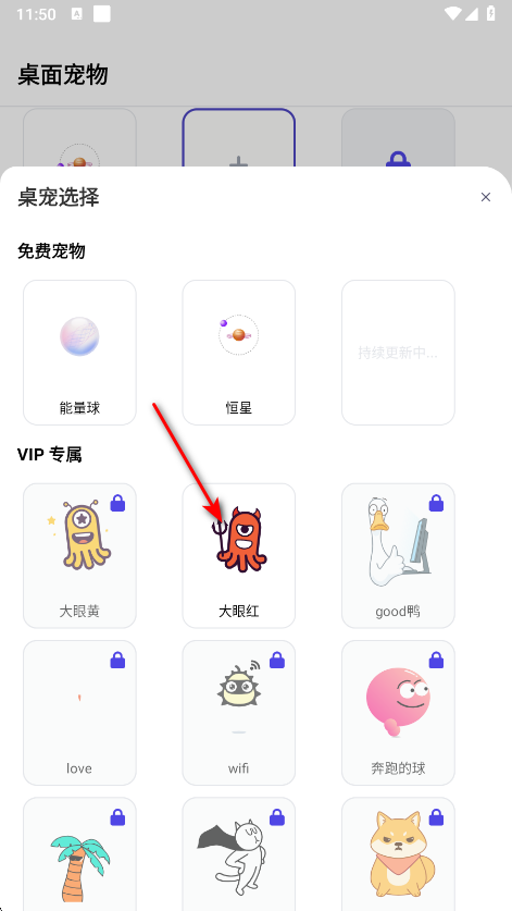 3、选择后返回,在主页面点击下图箭头所指按钮,萌宠就进入了桌面了;